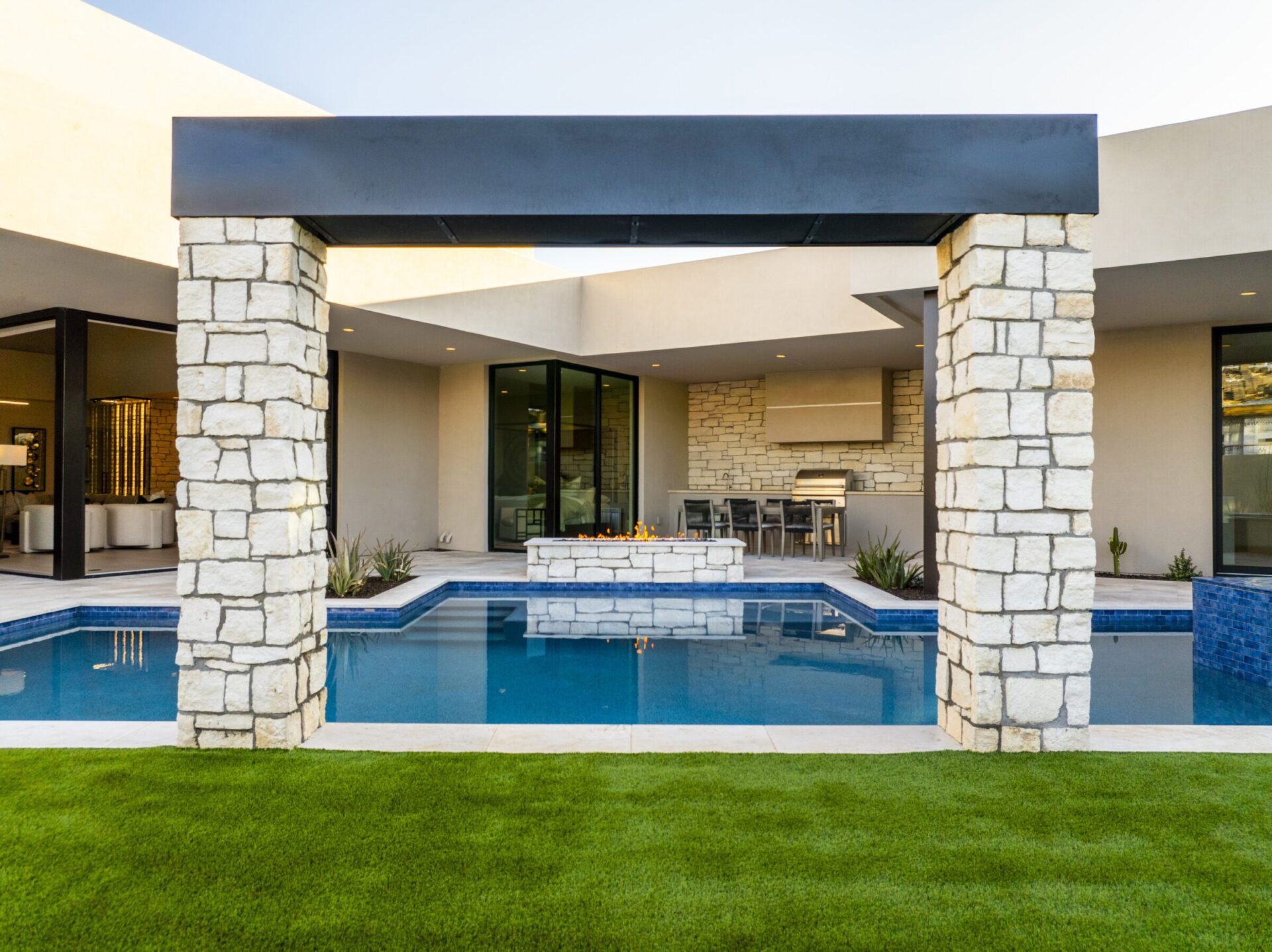 A full station often becomes the visual anchor of the yard. Masonry surrounds and stone finishes add permanence and balance. This approach mirrors the planning used in custom landscape designs where structure and function are developed together.