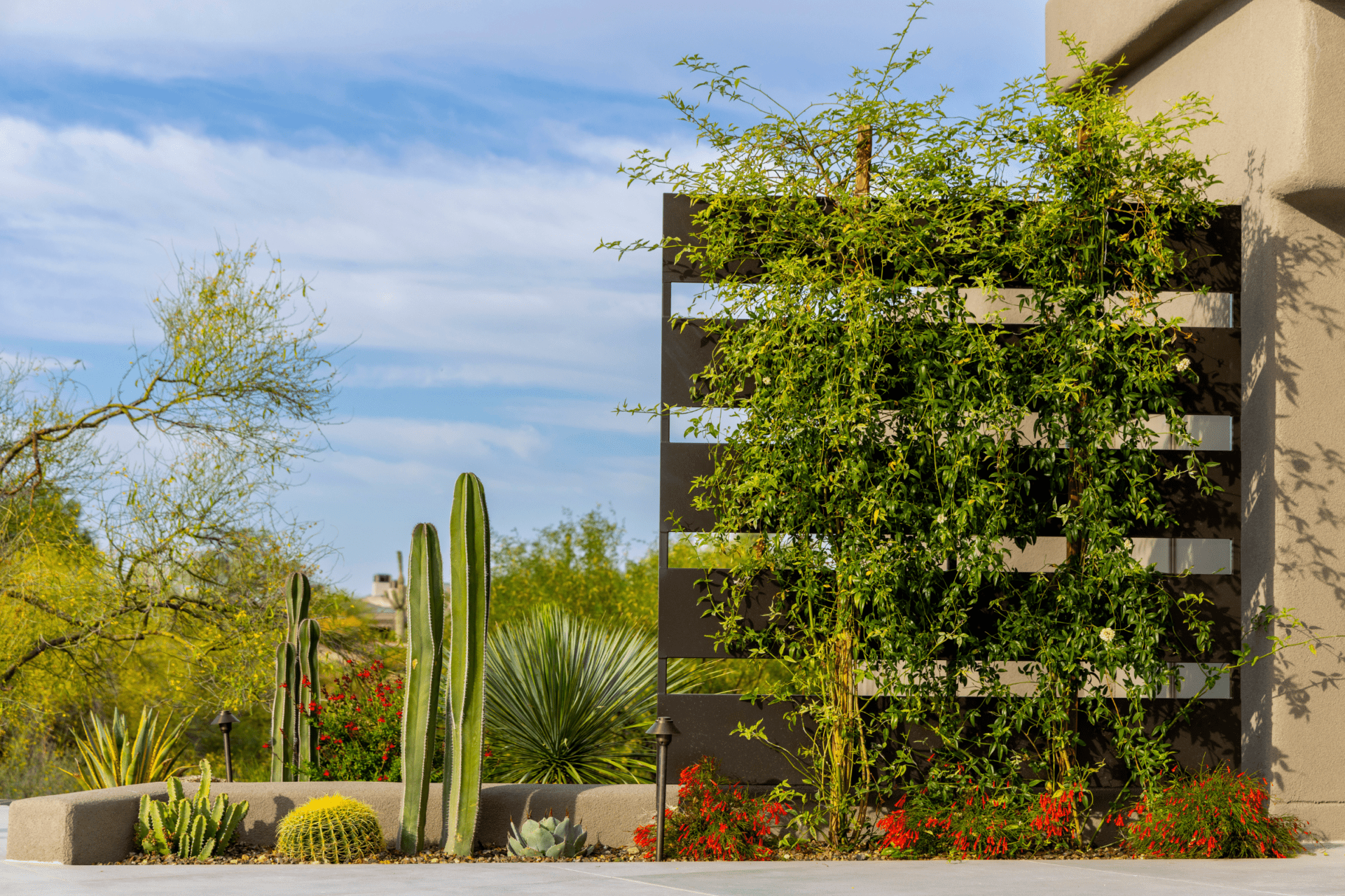 The cooling effects of the lushest desert landscape designs transform desert properties into private paradises. Opt for professionally curated installations featuring diverse clusters of cacti alongside blooming plants and vibrant ground cover for an unparalleled desert landscape design. Any desert oasis is incomplete without a water feature. Consider adding a pool or spa – or a spool if your yard is on the smaller side – or a peaceful water fountain to complete your private paradise.