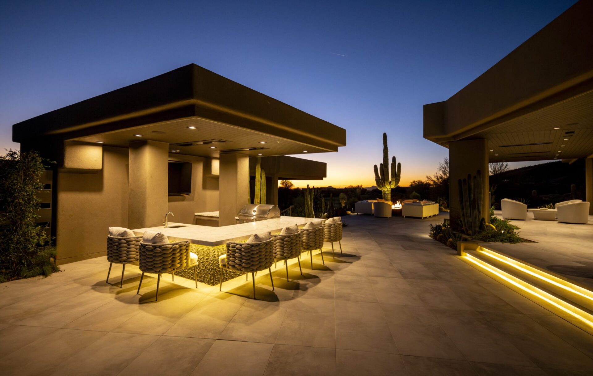 Adding discreet lighting near distinctive decorative elements is an excellent strategy to maintain your yard’s beauty after sunset. Another option is to incorporate a fire pit or fireplace, which not only provides extra light but also warmth. As seasoned desert residents are aware, nights in the desert can be chilly.